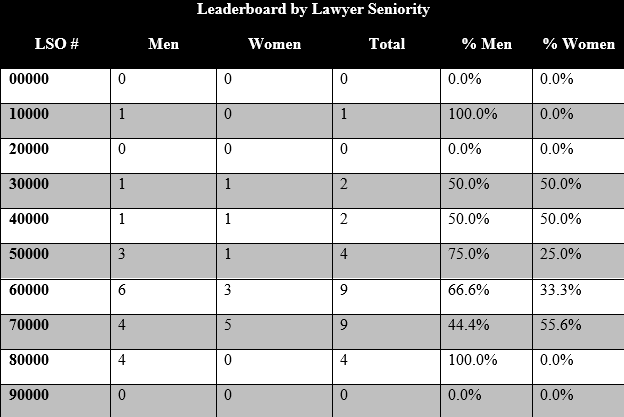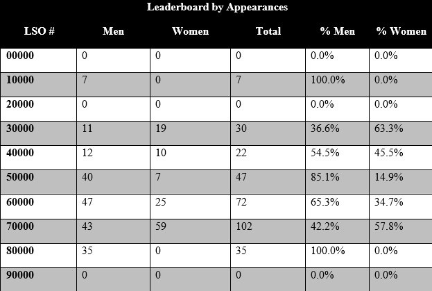 When the information is sorted by frequency of appearance, in all seniority bands except 30000 (in which there is one man and one woman), and the 70000s (which represents lawyers called to the bar in June of 2016 or later), men accounted for the majority of appearances across all levels of seniority on the leaderboard: